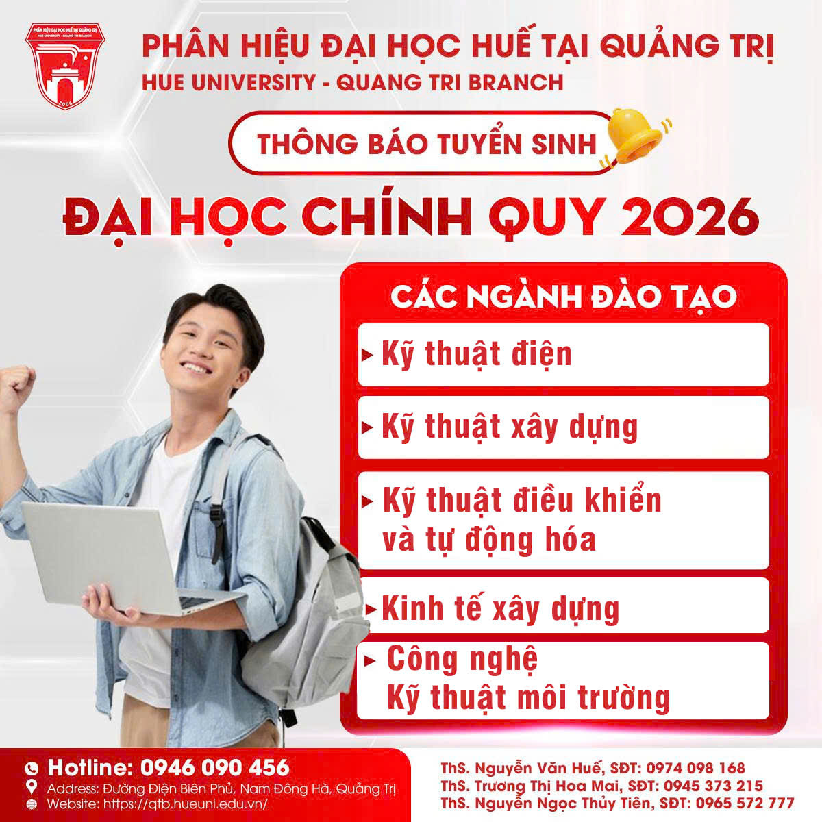 Đại học Huế vừa Công bố thông tin tuyển sinh Đại học chính quy năm 2025 (Dự thảo); Theo đó, năm 2025 Phân hiệu Đại học Huế tại Quảng Trị sẽ xét tuyển theo 3 phương thức cho 3 ngành tuyển sinh Kỹ thuật: Kỹ thuật Điện, Kỹ thuật điều khiển tự động hoá, Kỹ thuật xây dựng. Thông tin tuyển sinh chi tiết cụ thể như sau: